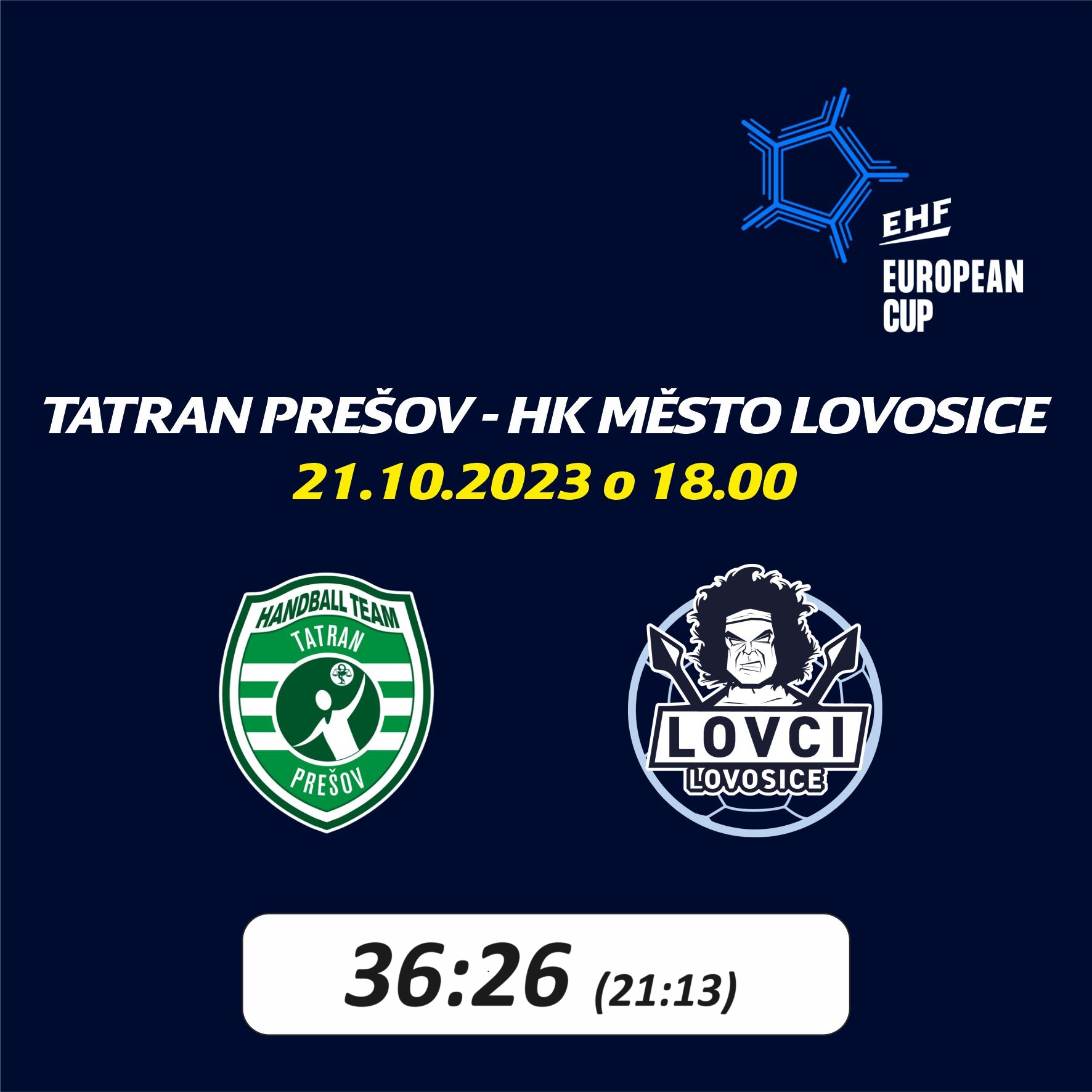 Hádzanári Tatrana Prešov postúpili do 3. kola Európskeho pohára EHF. Postup do ďalšej fázy tretej najvýznamnejšej európskej pohárovej súťaže potvrdili domácim víťazstvom nad českým tímom HK FCC Město Lovosice po výsledku 36:26 (21:13). Nadviazali ním na víťazstvo z palubovky súpera (32:28) a s celkovým skóre 68:54 sa prebojovali do ďalšej fázy súťaže. Tretie kolo Európskeho pohára EHF sa odohrá na prelome novembra a decembra (predbežne 25.11., odveta 2.12.). Žreb tejto fázy súťaže sa uskutoční v utorok 24. októbra vo viedenskom sídle EHF.