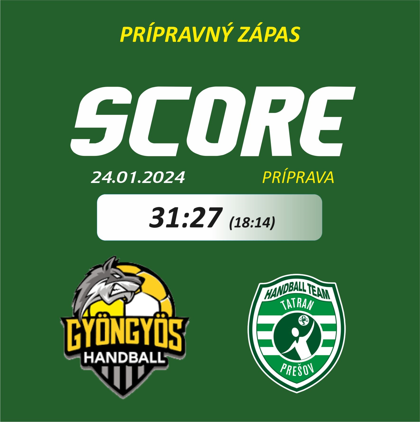 V poslednom prípravnom stretnutí pred štartom jarnej časti sezóny prehrali hádzanári Tatrana Prešov na palubovke maďarského Gyöngyösu o štyri góly 27:31 (14:18). Pod výsledok sa podpísali päť, resp. štvorgólová šnúra domáceho tímu v oboch polčasoch, v ktorej svojmu súperovi odskočili. Najlepším strelcom Tatrana v zápase bol Lukáš Urban, ktorý zaznamenal päť gólov.