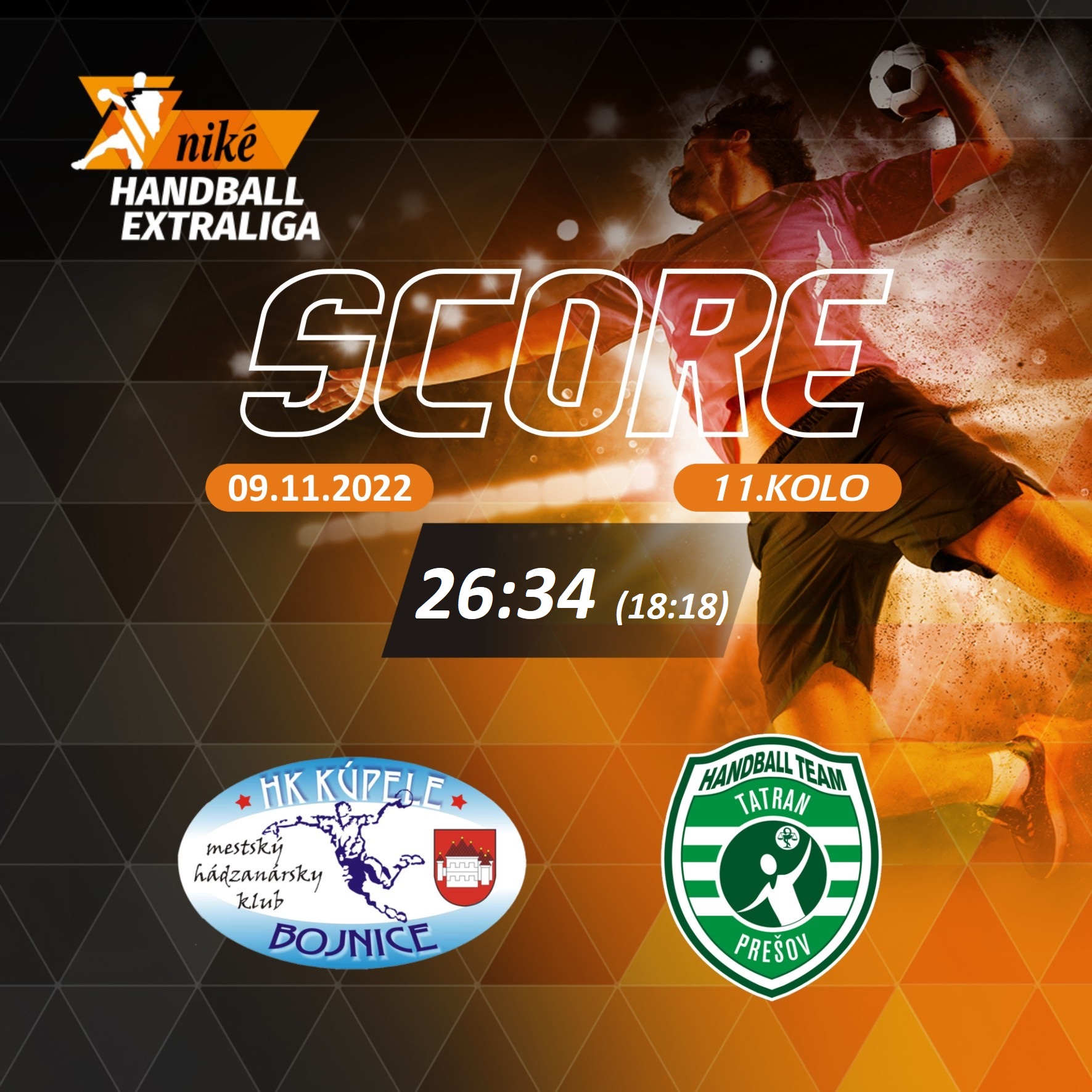 V predohrávanom stretnutí 11. kola Niké handball extraligy triumfovali hádzanári Tatrana Prešov, v súboji dvoch tímov z čela tabuľky, na palubovke HK Kúpele Bojnice výsledkom 34:26 (18:18). Slovenský hádzanársky majster sa tak v tabuľke od svojho súpera odpútal (po anulovaní výsledku so Šaľou, po jej odstúpení zo súťaže) na rozdiel troch bodov a má oproti Bojniciam zápas k dobru. Na konte Tatrana je aktuálne 16 bodov.