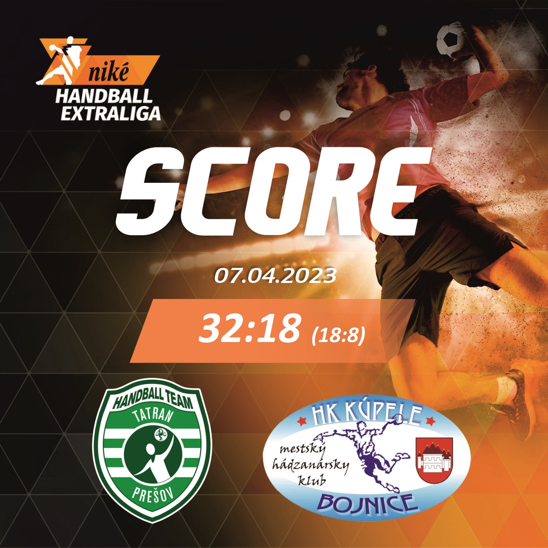 NHE – 1. semifinále: Tatran Prešov – HK Kúpele Bojnice 32:18 (18:8), séria: 1:0 na zápasy