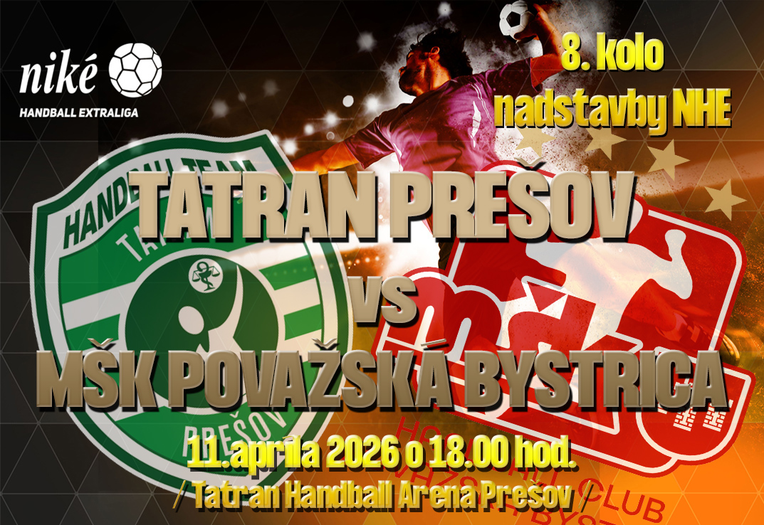 Hádzanári Tatran Prešov nastúpia v sobotu 11. apríla o 18:00 hod. na palubovke Tatran handball arény na zápas 8. kola nadstavby Niké Handball extraliga, v ktorom privítajú tradičného rivala MŠK Považská Bystrica. Pre Tatran pôjde o domácu rozlúčku s dlhodobou časťou súťaže a ďalší krok smerom k snahe udržať si neporaziteľnosť v súťaži a potvrdiť vedúcu pozíciu v tabuľke.