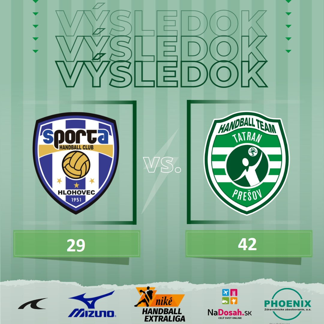 Jediným neporazeným tímom v tejto sezóne najvyššej domácej súťaže ostal po dnešnom šlágri 7. kola Niké handball extraligy v Hlohovci náš Tatran Prešov. Slovenský majster zdolal v súboji dvoch najlepšie postavených tímov, ktoré mali pred vzájomným súbojom na svojom konte plný počet bodov, domácu Sportu Hlohovec 42:29 (19:13). Tatran mal súboj od začiatku pevne v rukách a o svojom víťazstve rozhodol prakticky už v prvom polčase. Najlepším strelcom zelenobielych sa stal Pavel Hernandez s 8 gólmi, sekundoval mu sedemgólový Nuno Santos.