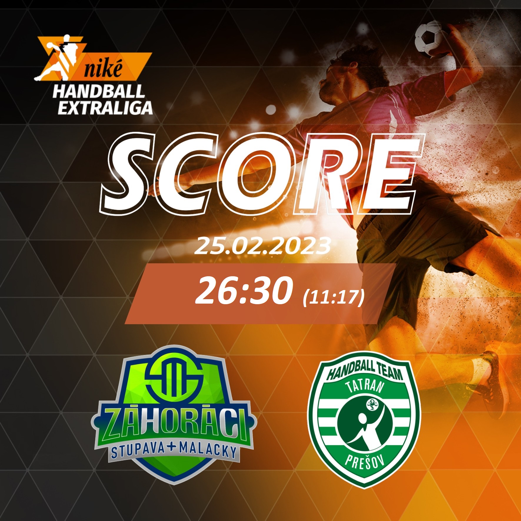 Štvorgólovým víťazstvom hádzanárov Tatrana Prešov sa skončil duel 21. kola Niké handball extraligy na palubovke tímu Záhoráci Stupava/Malacky. Favorit zápasu triumfoval proti aktuálne 9. tímu tabuľky výsledkom 30:26 (17:11). Zverenci trénera Mareka Gernáta si pripísali na svoje konto 17-te víťazstvo a so ziskom 34 bodov vedú tabuľku súťaže s dvojbodovým náskokom pred Považskou Bystricou. Tá ma však ešte dva zápasy k dobru, najbližšie v nedeľu nastúpi na palubovke vicemajstra z Košíc.