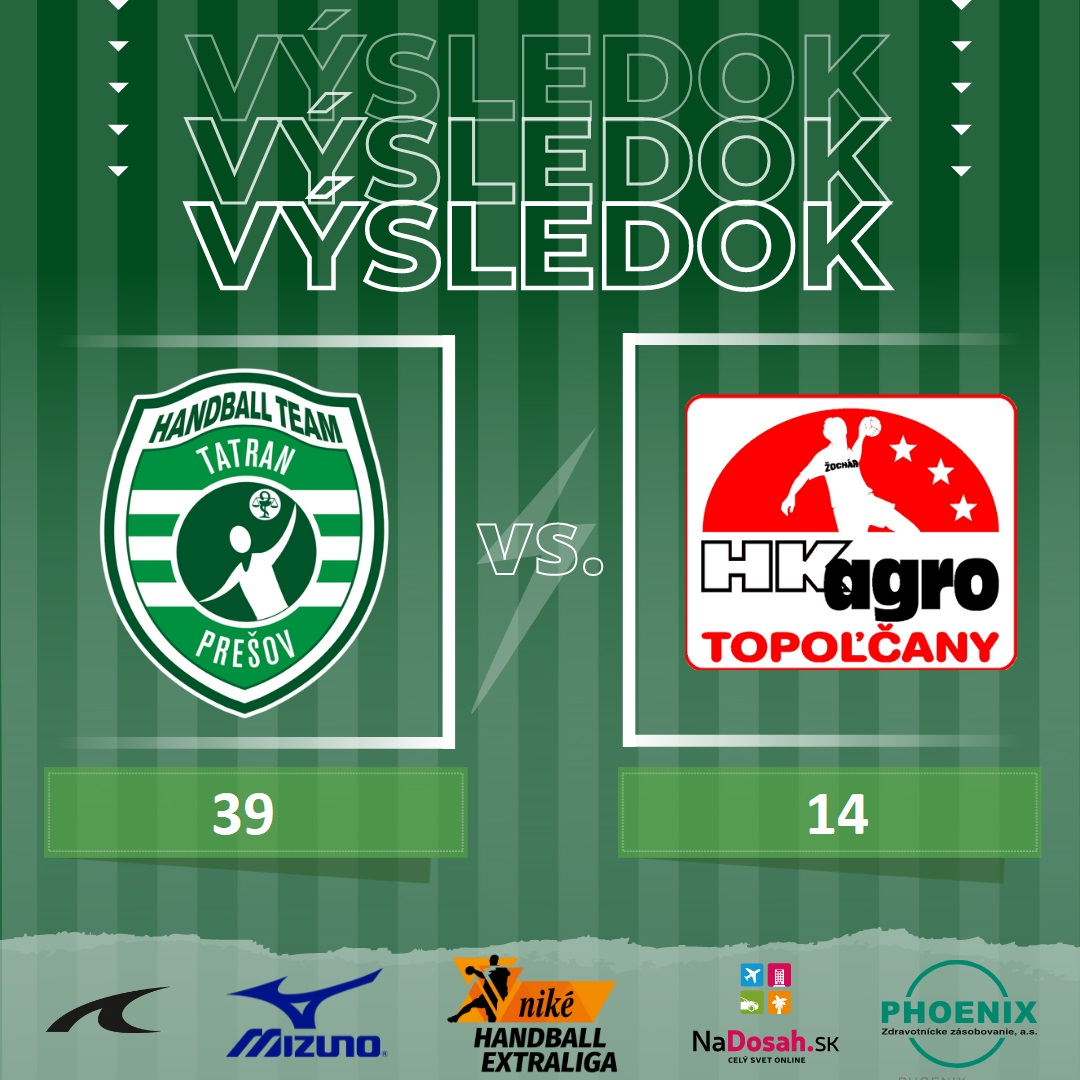 Vysoké 25-gólové víťazstvo zaznamenali hádzanári Tatrana Prešov v stretnutí 5. kola Niké handball extraligy, v ktorom na svojej palubovke privítali HK Agro Topoľčany. V Tatran handball aréne zvíťazili 39:14 (22:8) a naďalej v súťaži nezaváhali. Najlepším strelcom Tatrana bol Nuno Santos, ktorý strelil 11 gólov, z toho deväť v prvom polčase. Tromi presnými zásahmi sa pri svojom prvom vystúpení prezentoval Marco Antl.