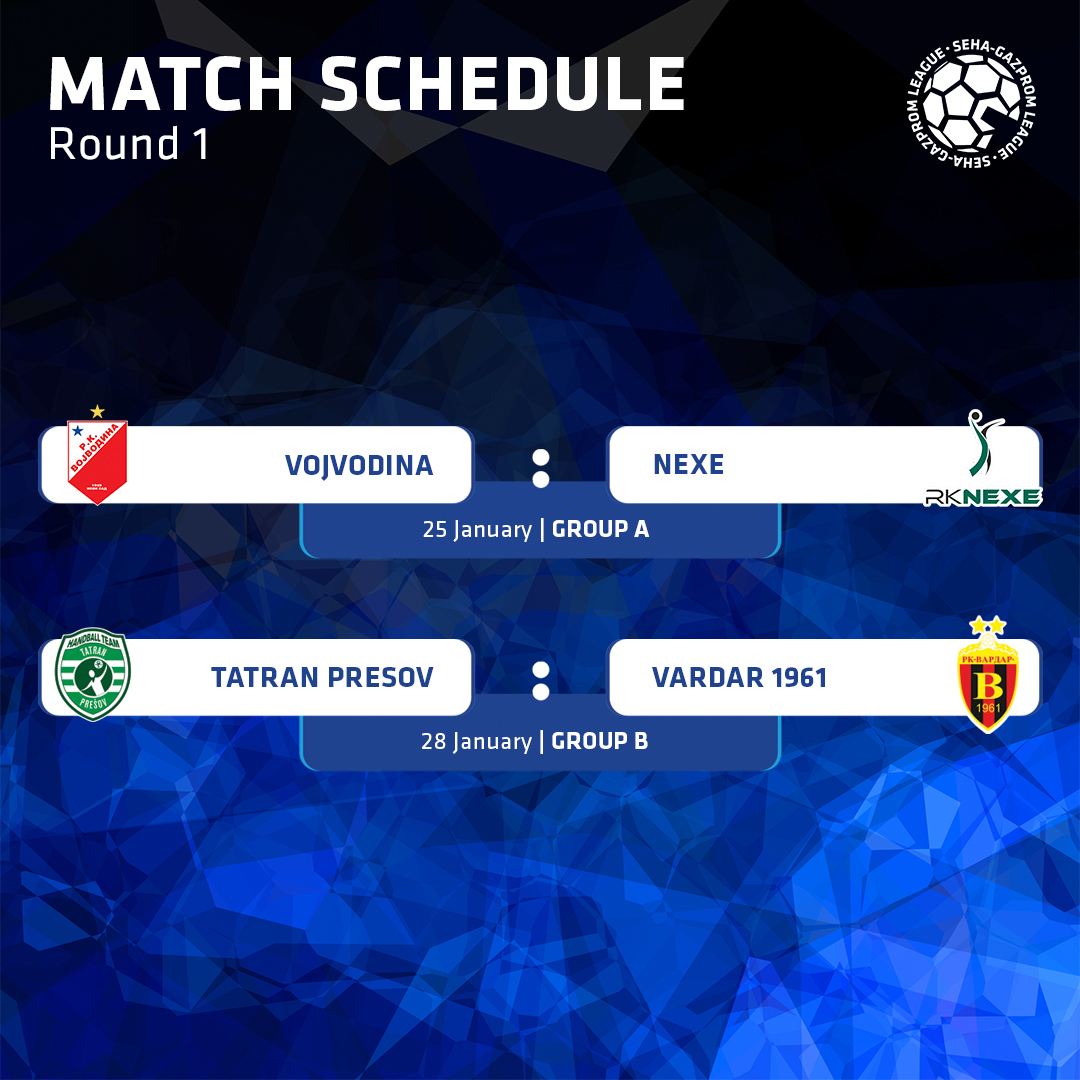 Nový ročník súťaže odštartuje v stredu 25. januára stretnutím medzi Vojvodinou Nový Sad a Nexe Našice (tretím účastníkom je Eurofarm Pelister). Hráči slovenského majstra Tatrana Prešov sa prvýkrát v novom ročníku SEHA ligy predstavia v sobotu 28. januára, kedy od 18:00 hod. v domácej Tatran handball aréne privítajú dvojnásobného víťaza Ligy majstrov a päťnásobného šampióna SEHA ligy Vardar Skopje. Po otváracom zápase skupiny B ich odveta proti rovnakému súperovi čaká na jeho palubovke v piatok 10. februára. Druhým súperom zelenobielych v skupine je Partizan Belehrad, s ktorým nás vzájomné zápasy čakajú v priebehu necelého týždňa na konci marca. Najskôr na domácej palubovke v utorok 21. marca. Odveta je na pôde súpera naplánovaná na pondelok 27. marca.