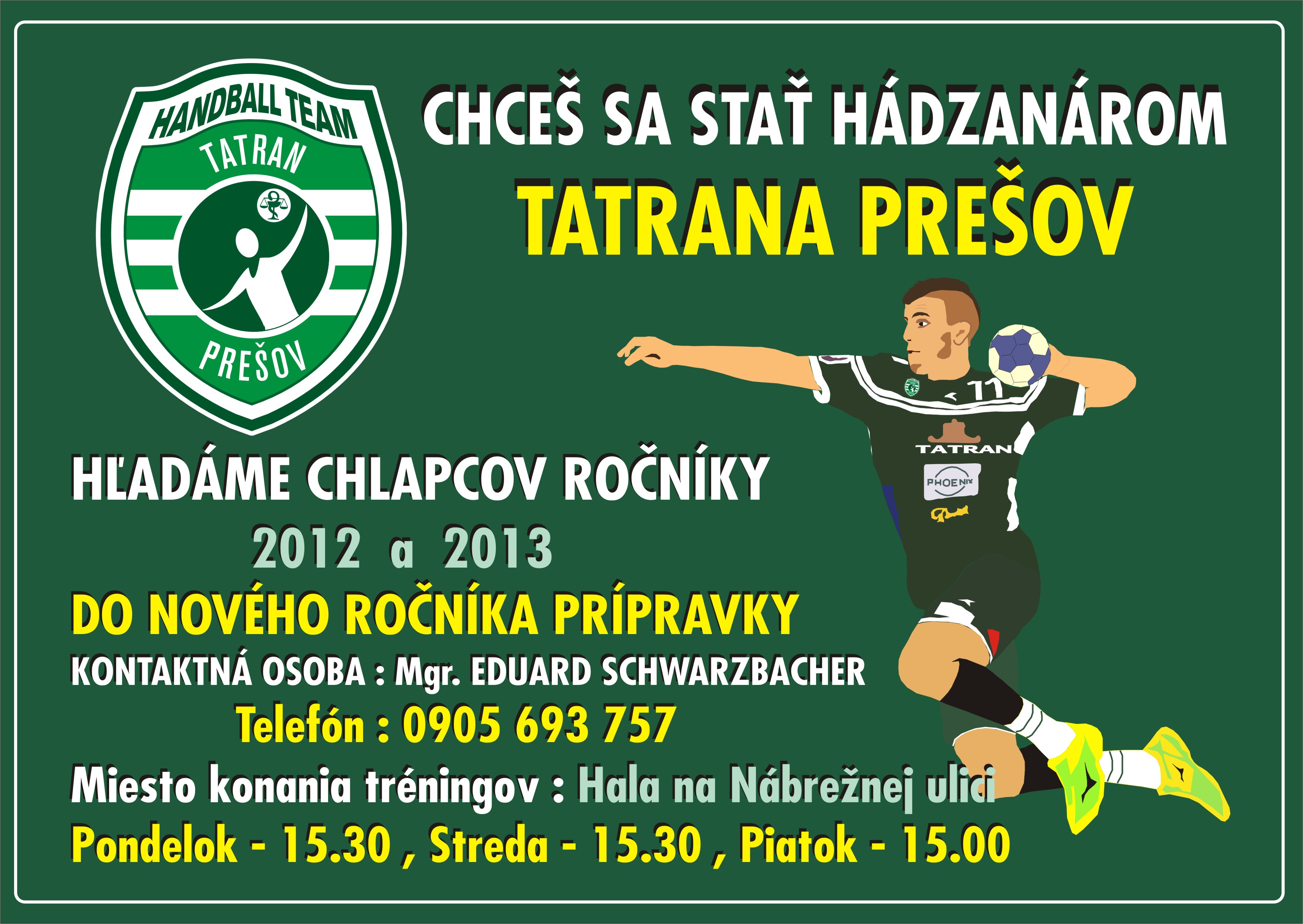 Hádzanári Tatrana Prešov medzi sebou radi privítajú nových nádejných hráčov. Do nového ročníka prípravky hľadáme chlapcov s ročníkmi narodenia 2012 a 2013, prípadne mladších. Prihlásiť sa však môžu aj starší chlapci. Príď si medzi nás, do najúspešnejšieho tímu na Slovensku, vyskúšať hádzanú!