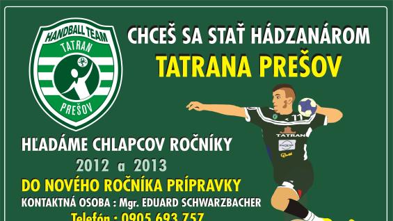 Hádzanári Tatrana Prešov medzi sebou radi privítajú nových nádejných hráčov. Do nového ročníka prípravky hľadáme chlapcov s ročníkmi narodenia 2012 a 2013, prípadne mladších. Prihlásiť sa však môžu aj starší chlapci. Príď si medzi nás, do najúspešnejšieho tímu na Slovensku, vyskúšať hádzanú!