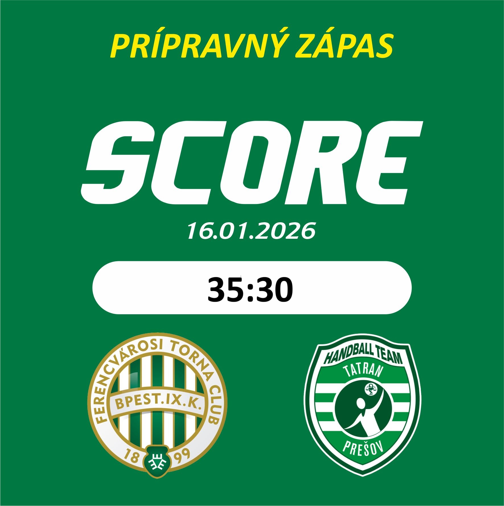 Hádzanári Tatrana Prešov odohrali v piatok svoj prvý a jediný prípravný duel pred štartom jarnej časti sezóny, ktorá sa pre nich začína už na budúci víkend. V súboji proti poprednému maďarskému klubu Ferencváros Green Collect Budapešť na jeho palubovke prehrali 30:35, pričom stretnutie sa hralo na 3x20 minút.